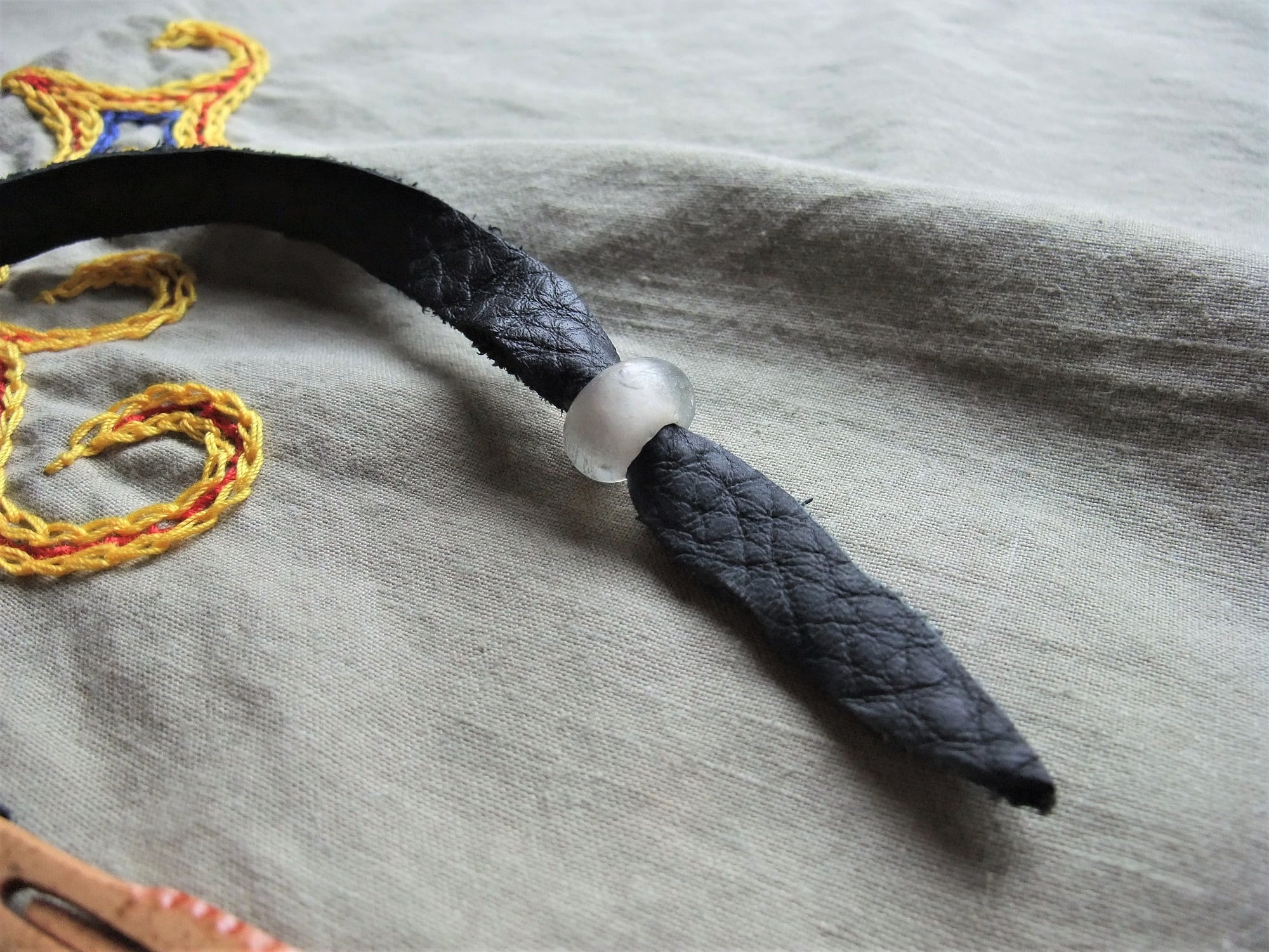 ムックリは通常、左手で保持するため左側に左手を通すヒモがついているのですが、この作品はヒモの代わりに革を手のひらに巻き付けてしっかり保持できます。