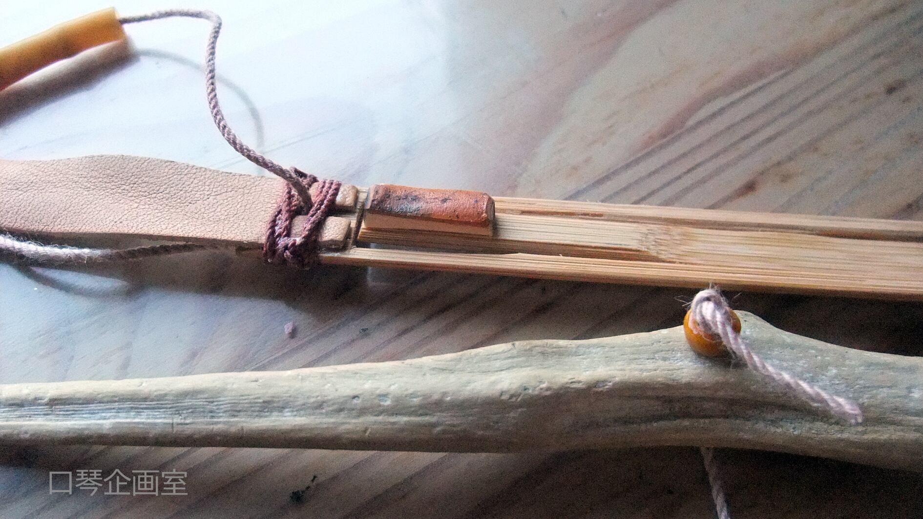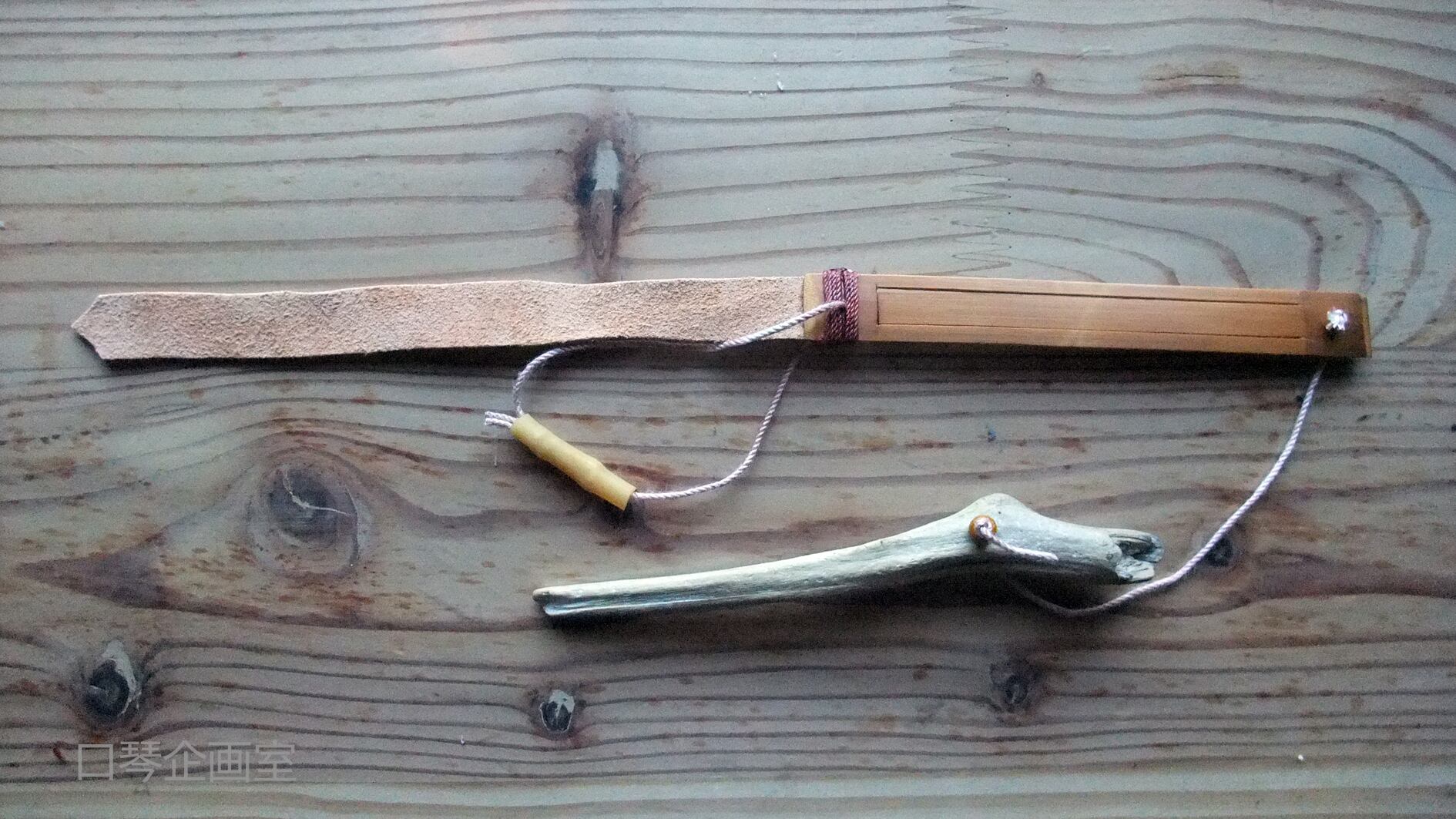 ムックリを支える側は革ひもと糸と両方を具備しましたので