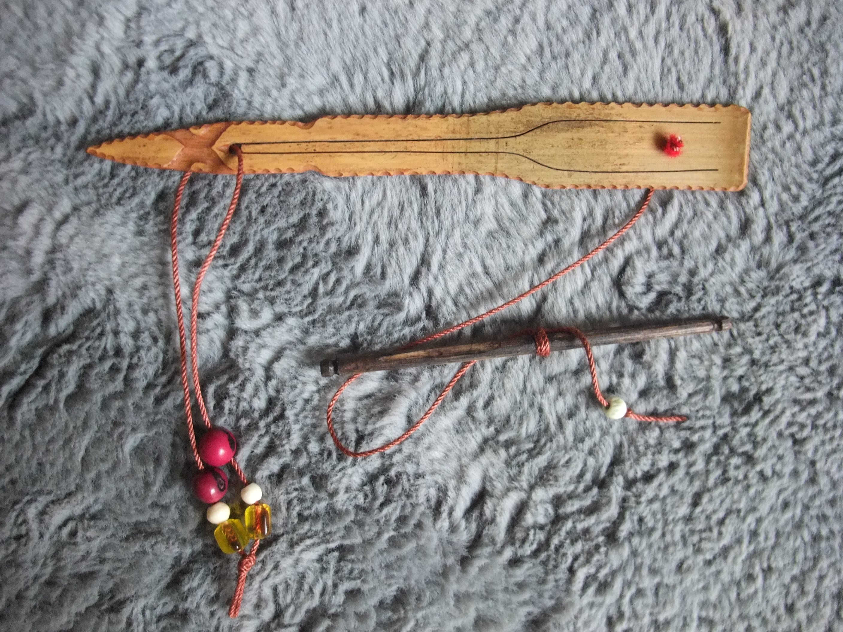 ・装飾は、ビーズや赤く染めたアサイーの種
