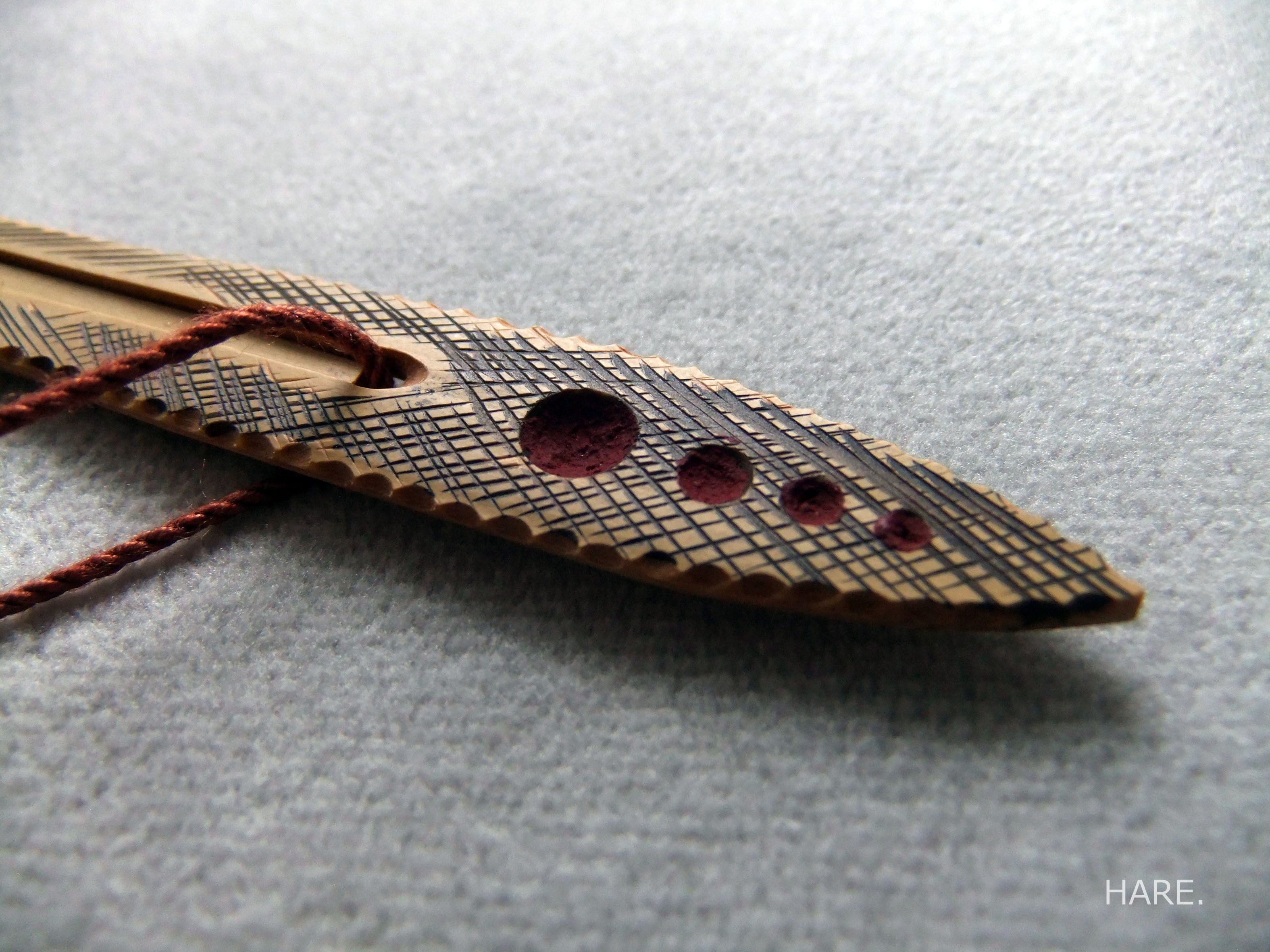 ・裏側面や表の彫刻面、棒などは柿渋染め。 表の彫刻面と棒はさらに鉄で焙煎し黒っぽくしています。