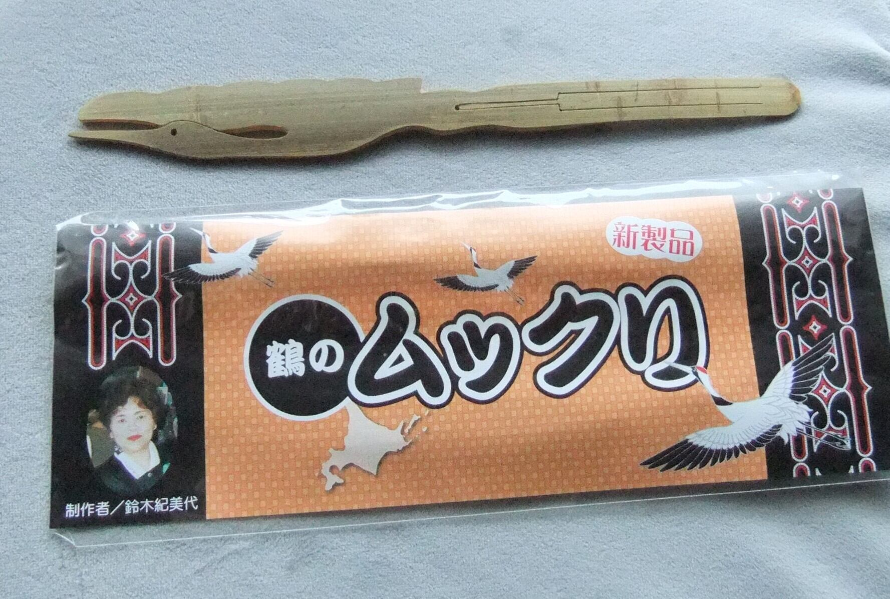鈴木紀美代氏作、鶴が飛ぶ姿を形にしたムックリ。